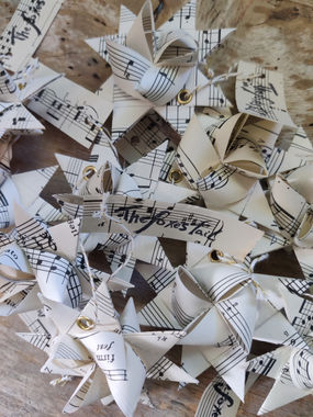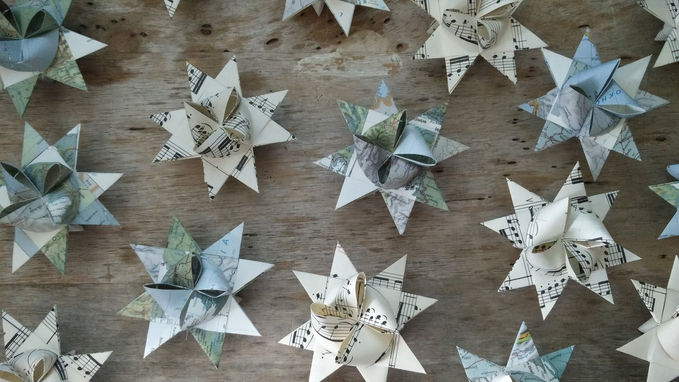 The Foxes Tail Moravian stars are crafted from hand cut strips upcycled from sheet music, maps and atlas pages